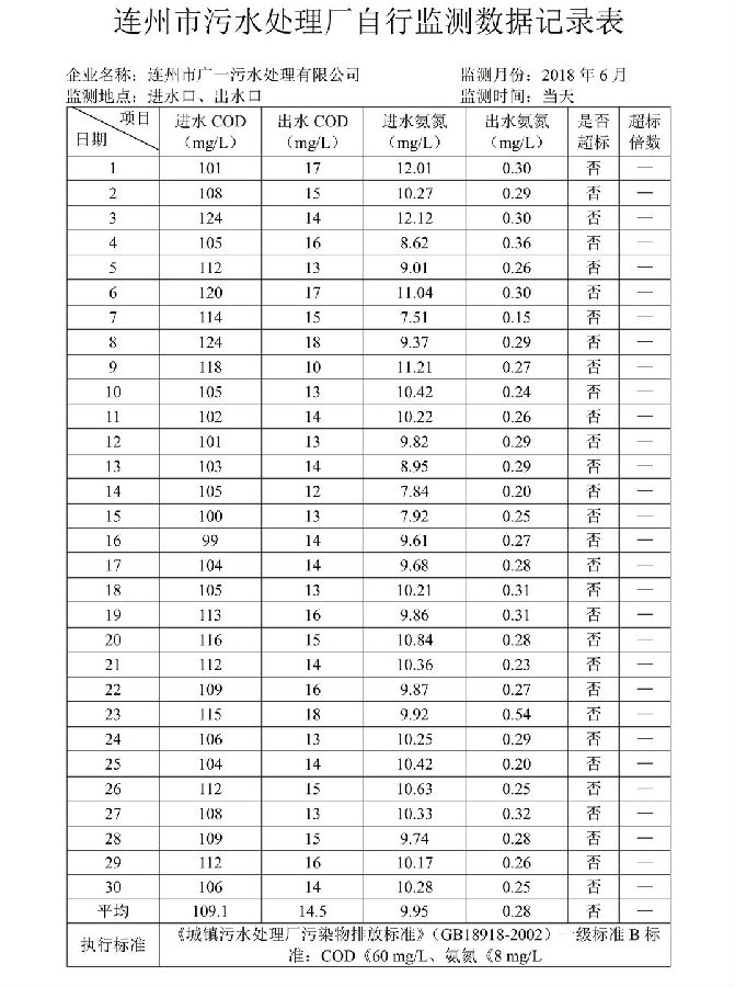 2018年6月自行監(jiān)測數據--連州市廣一污水處理有限公司