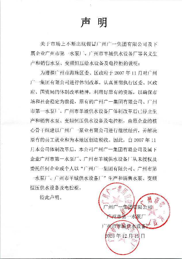 為遵循廣州市海珠區(qū)委、區(qū)政府于2007年11月對廣州廣一集團有限公司進行體制改革,認真貫徹執(zhí)行區(qū)委、區(qū)政府、國資局的體制改革精神,利用好原有的資源,以確保市場和社會穩(wěn)定為前提,原有的廣州廣一集團有限公司、廣州市第一水泵廠、廣州市羊城供水設備廠體制改革后已停止生產(chǎn)和銷售水泵、變頻恒壓供水設備及電控柜,由原企業(yè)的核心骨干組建以廣州廣一泵業(yè)有限公司進行繼續(xù)經(jīng)營,并解決原有的員工就業(yè)和為本地區(qū)創(chuàng)造稅收。因此,自2007年11月本公司體制改革后,本公司廣州廣一集團有限公司及屬下企業(yè)廣州市第一水泵廠、廣州市羊城供水設備廠從未授權及委托任何企業(yè)或個人以“廣州廣一集團有限公司、廣州市第一水泵廠、廣州市羊城供水設備廠”生產(chǎn)和銷售水泵、變頻恒壓供水設備及電控柜。特此聲明。